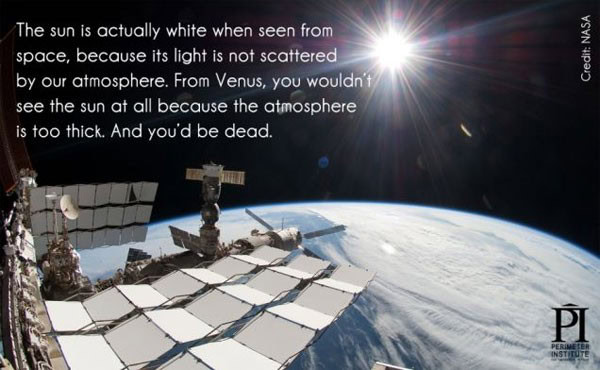 1. Khi ra khỏi khí quyển Trái Đất và nhìn Mặt Trời, bạn sẽ thấy mặt trời có màu trắng chứ không phải màu vàng, lý do mặt trời ở dưới đất màu vàng là ánh sáng bị khí quyển phân tán. Nếu bạn ở Venus (Sao Kim), bạn thậm chí không thể nhìn thấy mặt trời do khí quyển quá dày, và ở đây bạn sẽ bị điếc.